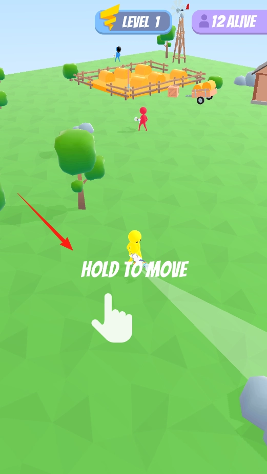 2、进入第一关,根据HOLD TO MOVE提示,长按屏幕,控制黄色角色移动,在场景中,躲避敌人,寻找攻击时机,利用长按移动机制,进行战斗。