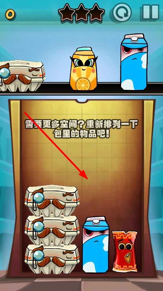 1. 物品放置与压缩步骤:首先判断物品之间的压制关系,接着按照一定顺序把物品放进袋子里。利用高等级物品去压扁低等级物品,比如先放入果汁,随后放入牛奶,让牛奶在果汁的作用下被压缩,最后放入西瓜,通过西瓜将剩余物品压扁,以此达到节省空间的目的。