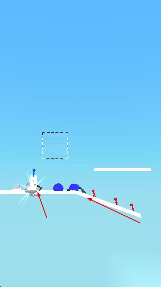 2、建造掩体时,可让巨石滚落,借助斜坡物理特性,撞击、消灭路径上的红色小人,减少威胁。