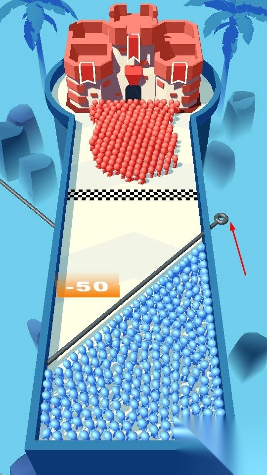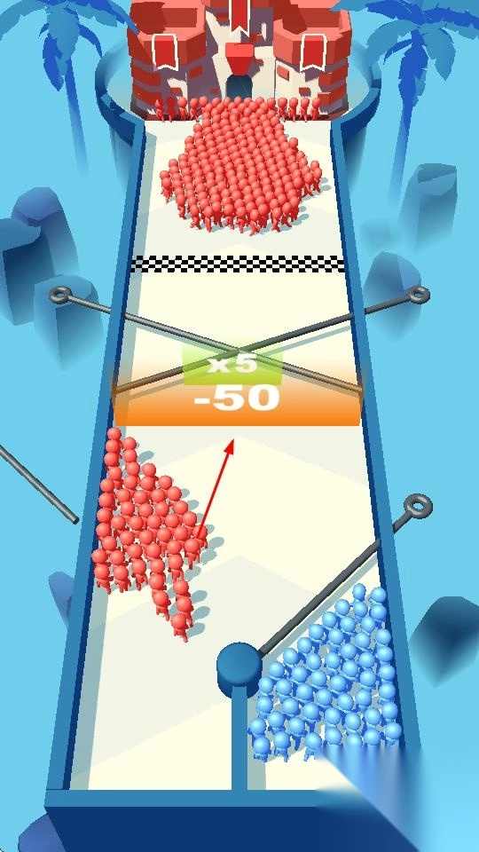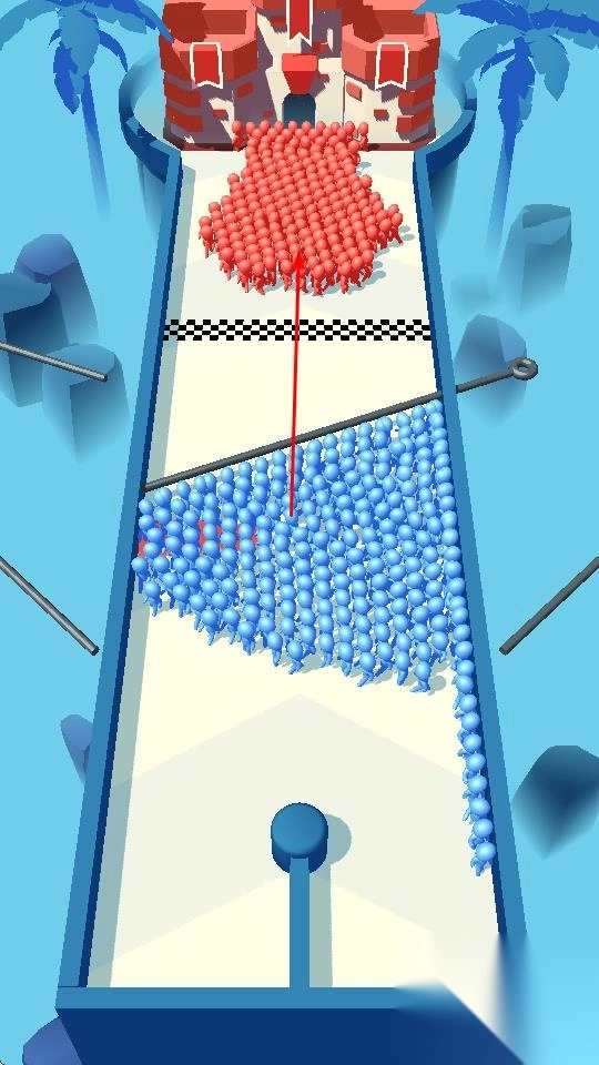 1、通过拔插销,分割蓝色人群,调整行进路线,让部分人群通过增益区,强化兵力。