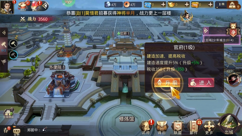 2、这里以秦国为例,游戏初期可优先升级官府,提升国力,并带来更高的税收收益。