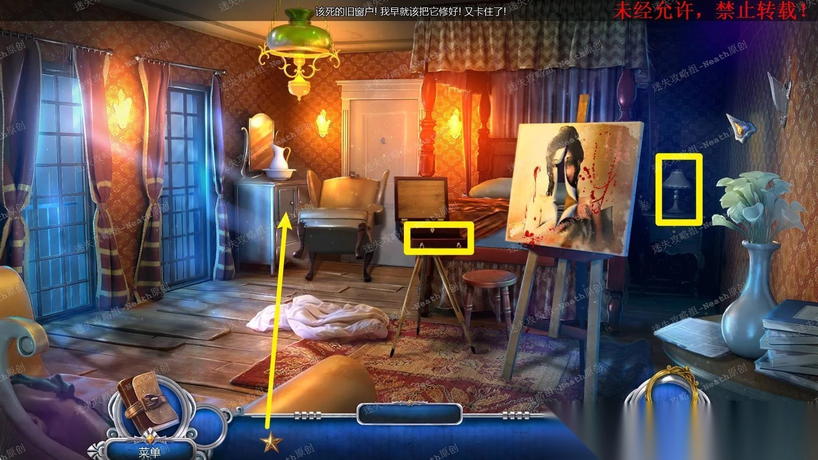 4、把椅子拖过来堵住门,接着打开右边的台灯,从盒子里取走【凿子】,用【小黄铜星星】打开柜子,拿走【床单】以及【抽屉钥匙】。4 4.1