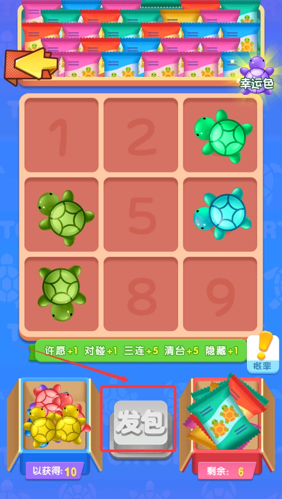 3、轻点“发包”,让小乌龟来个三连,接着进行对碰操作。