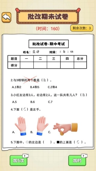 1. 进入参与批改试卷的模式,需在给定的规定时间里,找出试卷里的错题,对学生答案的对错做出判断,并计算出最终得分,以此完成关卡挑战。