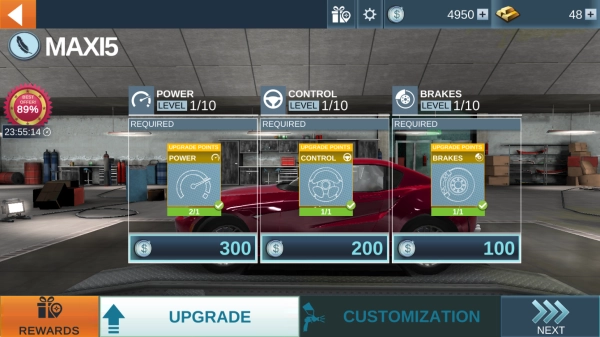 3、你可以通过赚取的游戏货币升级车辆的发动机、刹车、悬挂系统等部件,提升爱车的性能。