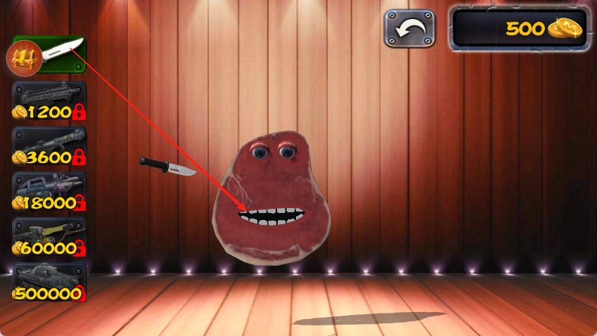 1、进入游戏之后,你会看到一个牛排怪物,点击刀具对它进行切割。