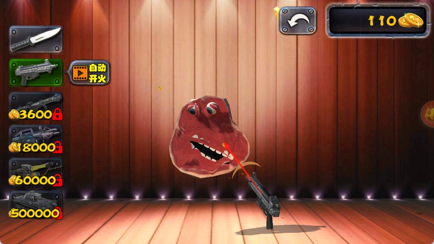 4、还可以解锁更多的工具,比如枪支,对着牛排随意射击,也有金币收益。