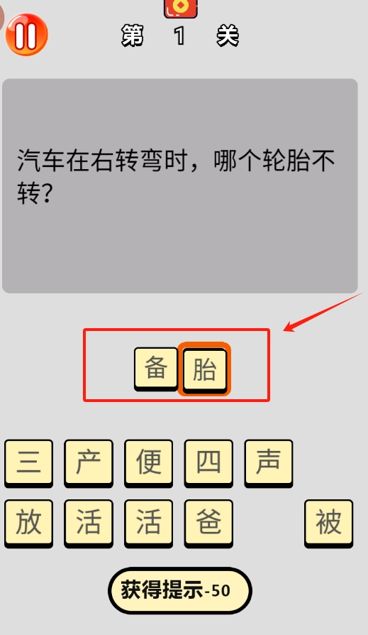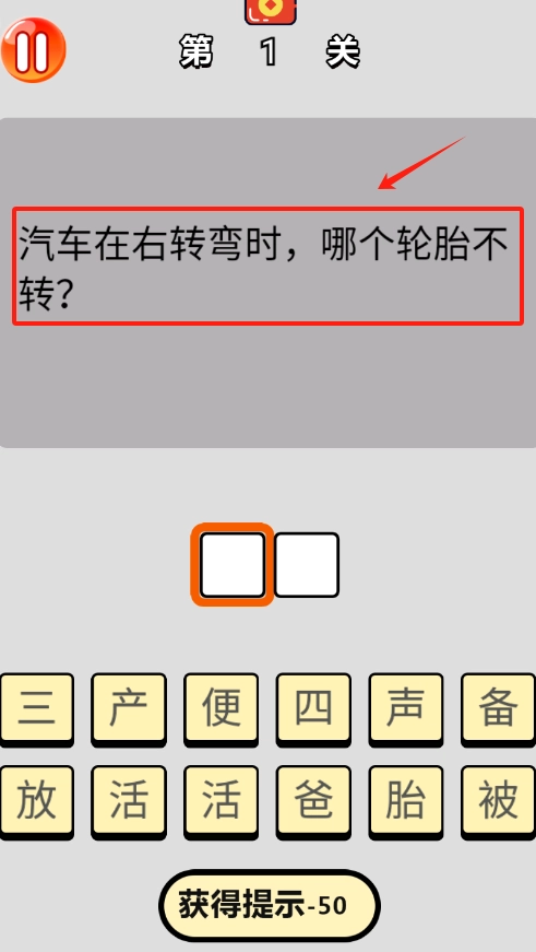 2、题目为汽车右转弯时哪个轮胎不转,你可以在下方输入框输入答案,也能从选项中挑选。要是想不出来,点击“获得提示”会扣除50 。