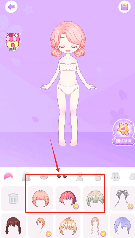 2、看到粉色双马尾少女以及被红框圈起来的三个发型,点击其中任意一个发型,就可以为女孩换上新发型啦。
