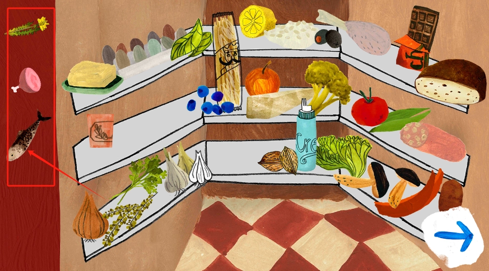 3、用炉灶和搅拌机做菜,案板上有鱼,右下角刷新换食材。