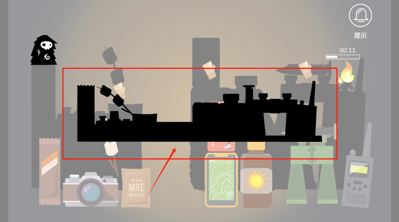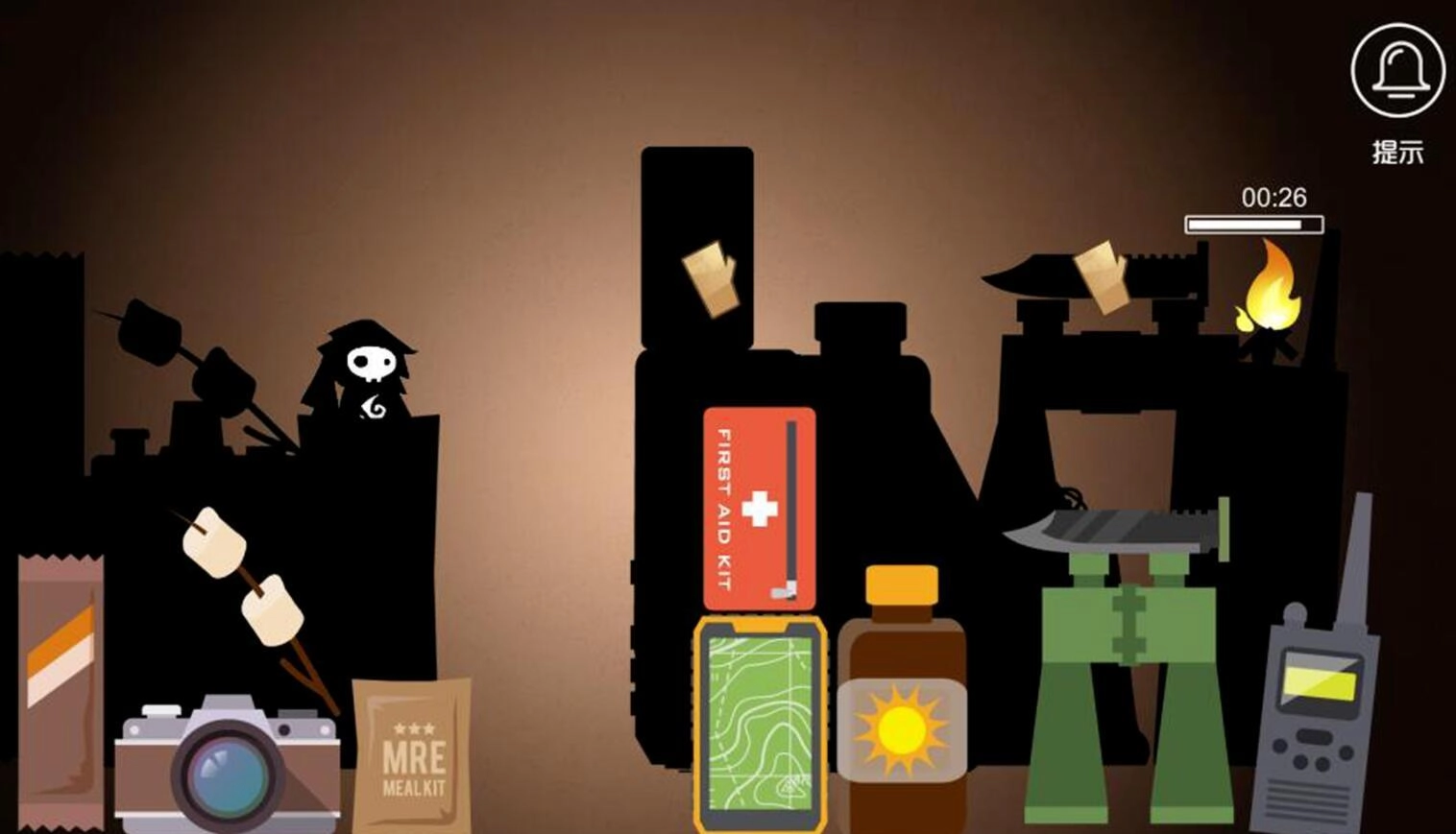 2、看红框里的物品,记住急救包和食物的位置,右上角有时间提示。