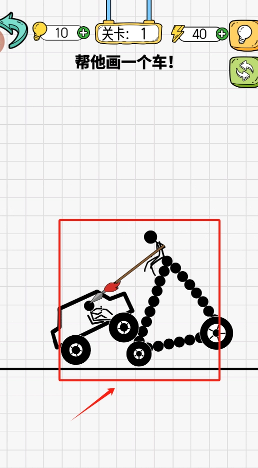 3、瞧见下方方格里的火柴人车和上方提示,按提示要求画出车辆让火柴人顺利通过关卡。