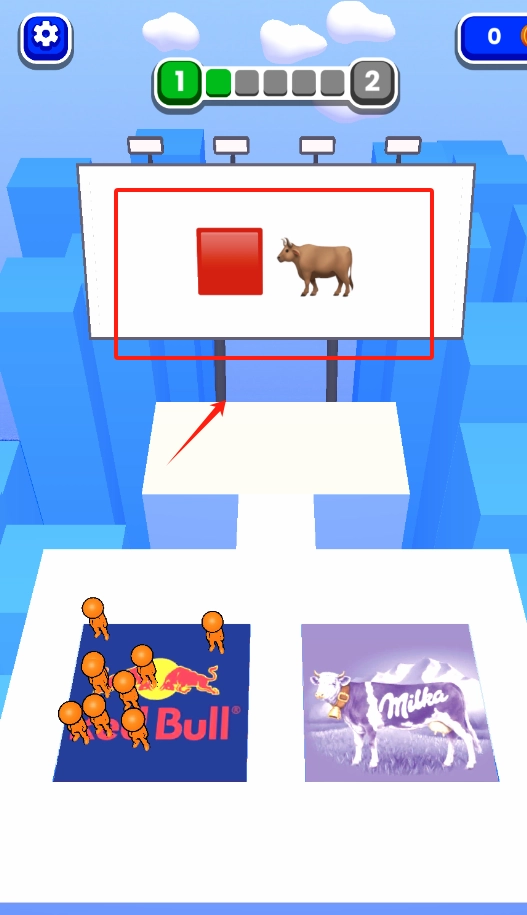 3、红牛广告围了一群橙色小人,点红色方块牛头,它们就会集体转移阵地啦。