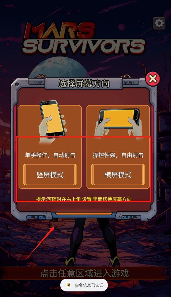 2、点击竖屏模式或横屏模式选屏幕方向,点任意处进游戏。