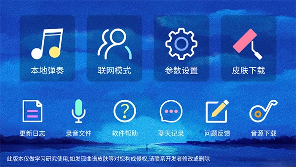 游戏分为五个模式,分别是:新手模式,游戏模式,自由模式,钢琴键盘模式和欣赏模式。