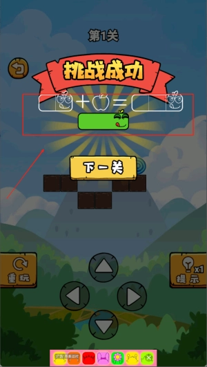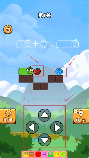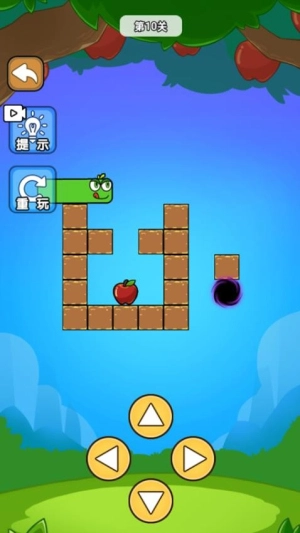 2、借助下方的方向按键操控小蛇吃到苹果,并以不同姿态移动至蓝色的传送门漩涡当中。