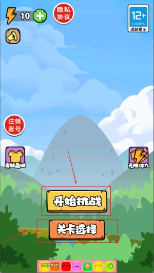 1、进入游戏后,可以选择开始挑战进行游戏,也可以关卡选择玩已经通关的关卡。