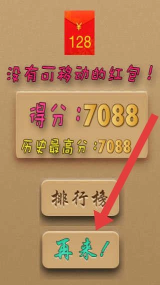 3、结算界面,若“没有可移动的红包”,点击【再来!】,重新开局,挑战历史最高分(7088)。