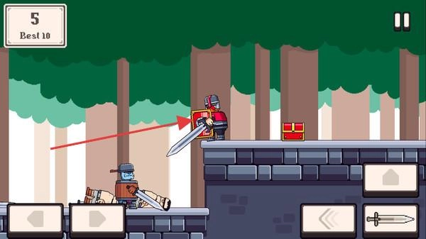 3、进入战斗界面,你将操控手持剑盾的骑士,在森林场景中与诸如蓝色盔甲角色之类的敌人展开战斗。过程中要留意红色的宝箱,通过按键来实现攻击与移动操作,努力获取Best10的高分成绩。