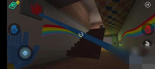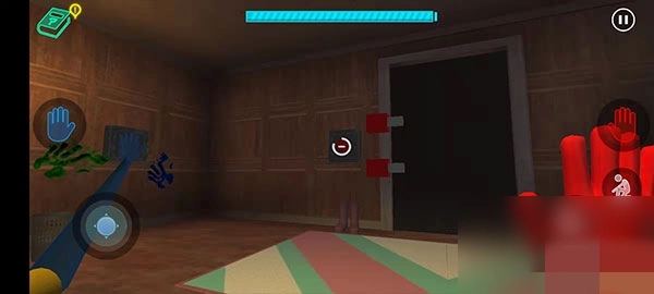 4、手套收集完毕后会自动出现在玩家手中,此时能看到墙的两侧分别有红色和蓝色的手印,玩家只需把手套对准对应的区域,就能打开房门。