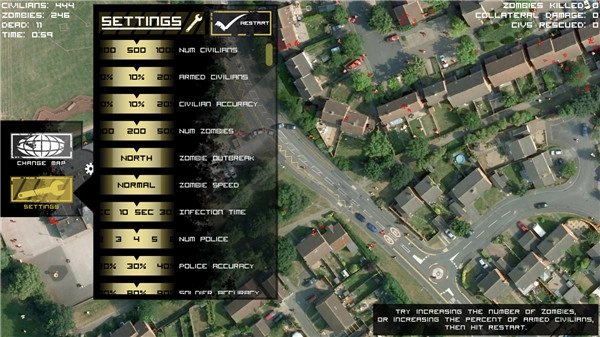 3、在游戏界面左侧,能够对游戏的难易程度以及僵尸和人类的强度进行调节。