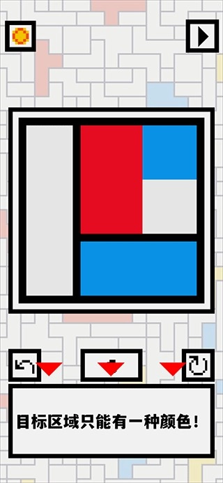 1、本游戏采用平面解谜玩法,按照下方的玩法说明,把相同颜色的色块放置到同一个黑框内,且能使黑框完全被填满。