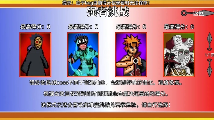 像素火影金身水门版本,操作简便,玩法多样,简直是闲暇时光的绝佳伴侣,能让你轻松畅享游戏乐趣。在这里,一场精彩刺激的对决挑战正等你开启!它凭借独特的游戏玩法、与经典IP的巧妙融合,以及持续更新的丰富内容,为玩家带来极致的火影格斗体验,绝对是火影粉丝不容错过的精品之作。不管你是想重温火影那些经典场景,还是尝试挑战高难度动作格斗,这款游戏都能满足你的需求。别再犹豫,快来开启专属于你的忍者之旅吧!