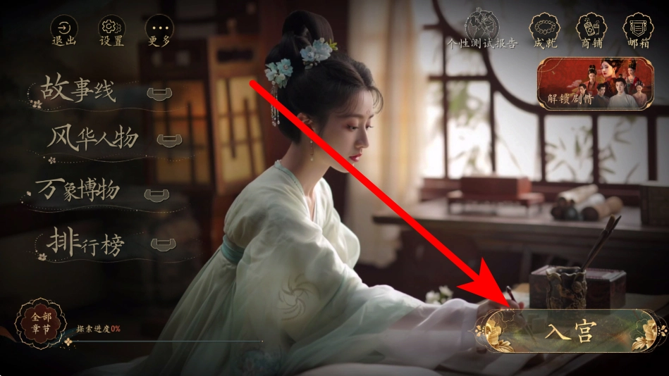 1、玩家第一步开启入宫流程,于游戏界面里,点击“入宫开始游戏”按钮,由此开启宫廷探索之旅,进而进入宫廷的初始场景。
