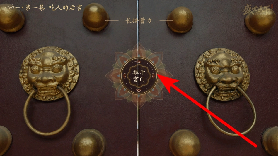 2、接着推开宫门,当站在宫门前时,依照提示长按进行蓄力,完成推开宫门这一动作,进而进入宫门后的宫廷区域。