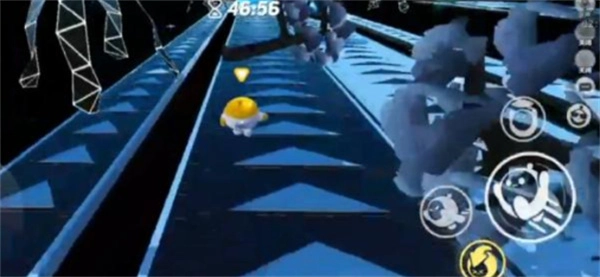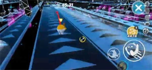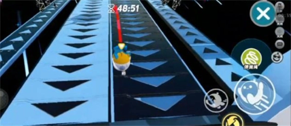 5、拿到缩小药水后,先往回拉一下,接着使用缩小药水迅速开启滚动。在加速带上千万不要跳跃,一旦跳跃,就会碰到上方隐形的销毁装置,碰到它我们就会复位。此时,要一直向前拉动方向键,不要停下,因为这样能缩短行进距离。要是中途停止,角色就会原地不动。