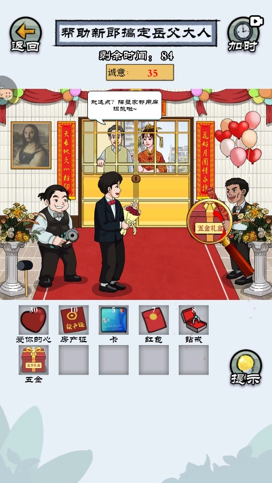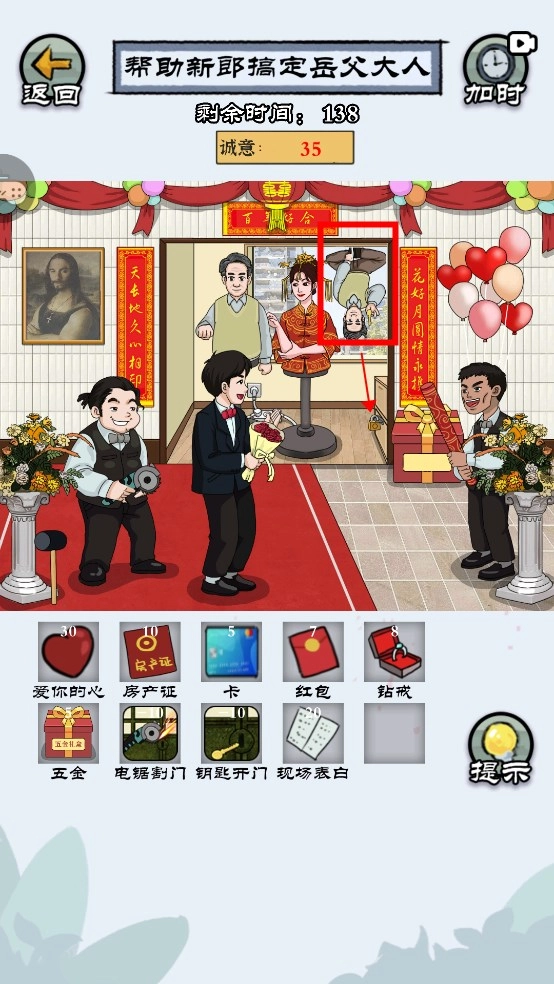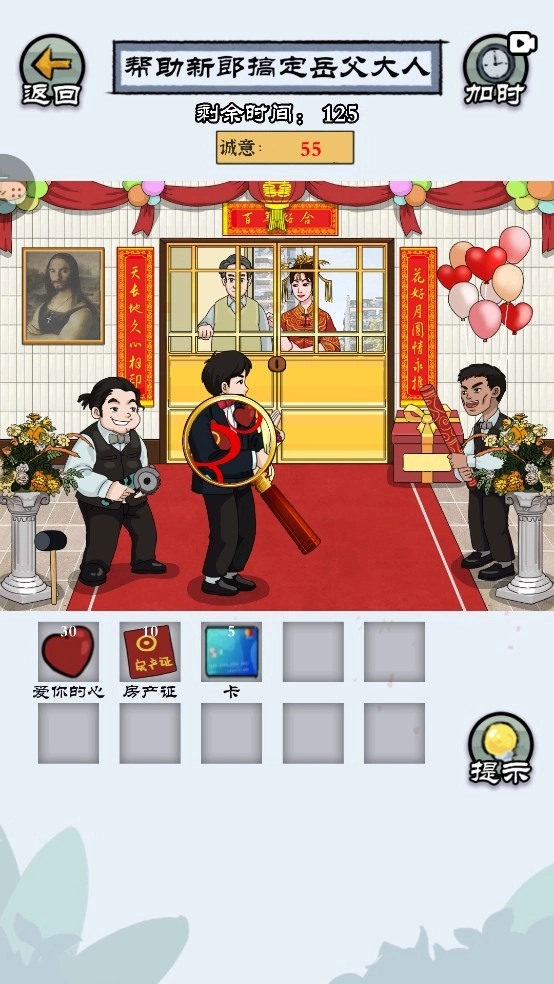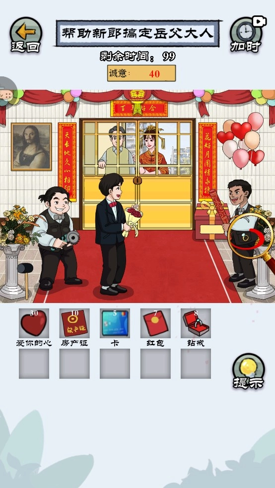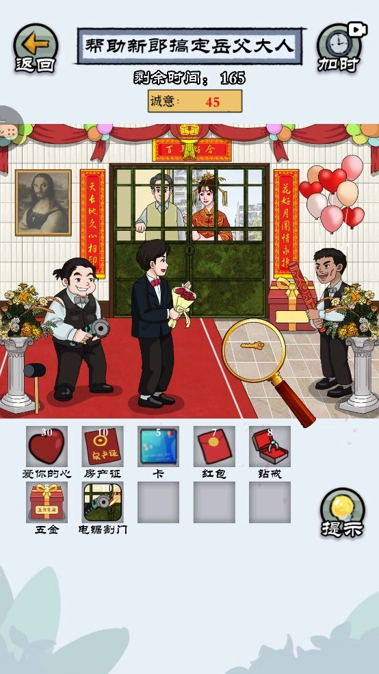 -把放大镜拖到新郎身上,找寻房产证、银行卡以及爱你的那颗心。