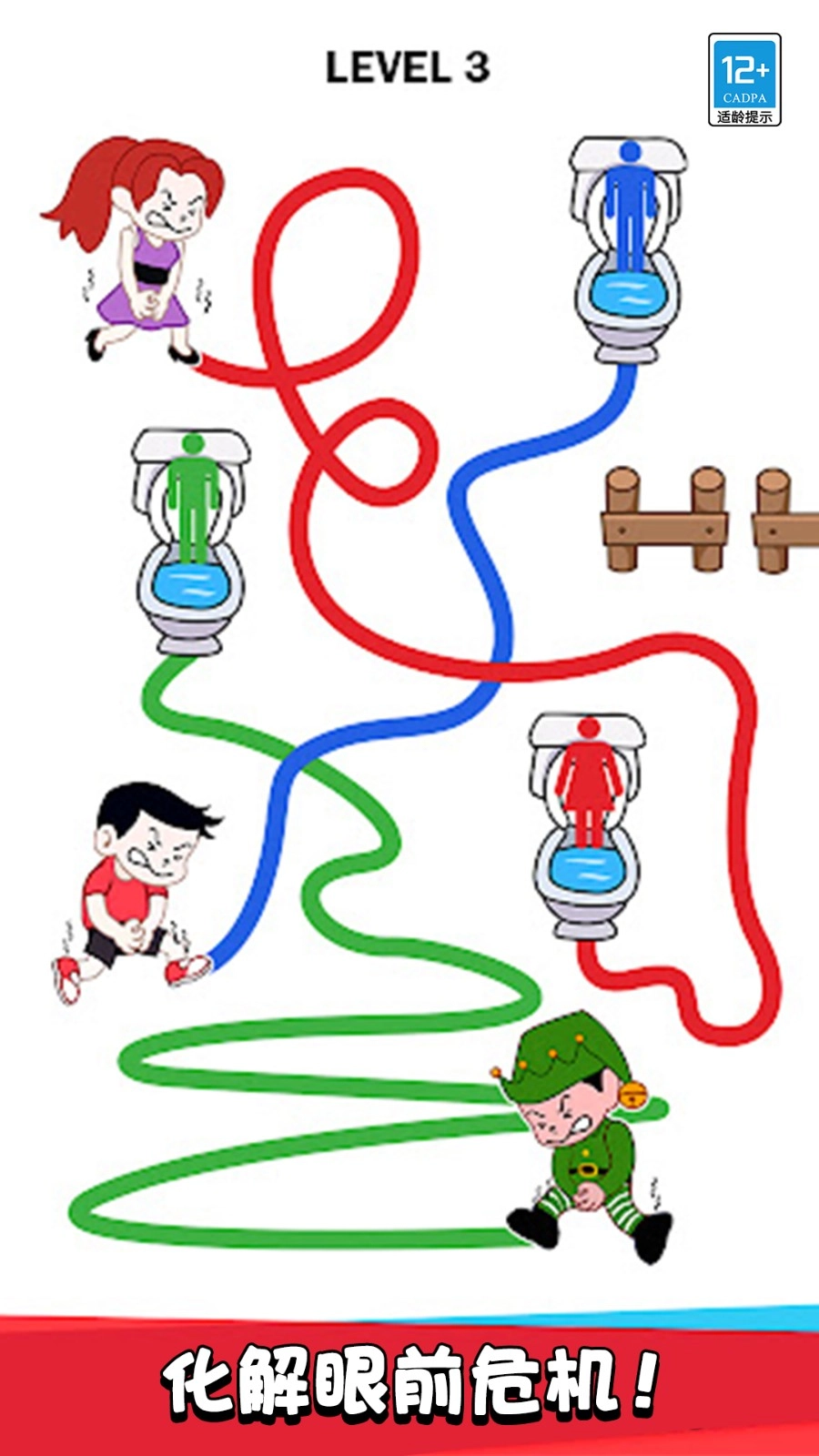 解环大师,一款趣味十足的休闲益智游戏。它采用类似迷宫的玩法设计,玩家得依据角色与厕所马桶的位置,画出各异路线,快速奔向厕所以解决难题。而且,游戏设有时间限制,玩家必须在规定时间内完成基本的路线规划与设计,不然就会直接闯关失败,重新开始规划。随着关卡的推进,迷宫会愈发复杂困难,要想完美通关,就得充分施展自身的技巧和经验,稍有失误便可能直接失败。在游戏里,玩家依照简单的提示指引,迅速滑动形成不同路线,朝着终点前进。喜爱此类游戏的朋友,快来体验一番,千万别错过啦!