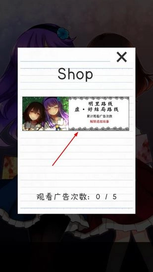 1、付费结局中,明理路线虚的部分其实很好解决。若想解锁这个结局,操作十分简单,只需观看5个广告就行,具体操作如下图所示:我们在游戏主界面点击【shop】 。
