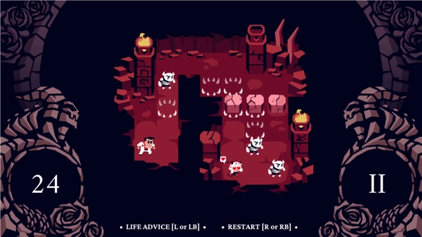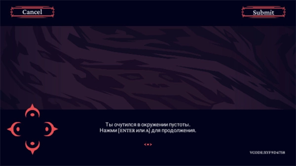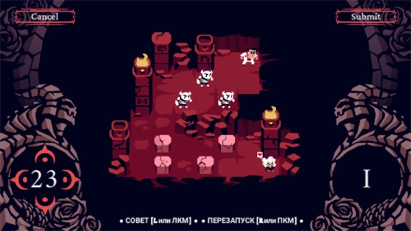 1、在本站安装好《Helltaker》无敌版后,打开游戏即可直接开始游玩。游戏界面左上角的“Cancel”为取消按钮,在游戏过程中可用于暂停游戏;右上角的“Submit”是确认按钮,能用来确定选项;而左下角则用于控制人物移动或选择选项。