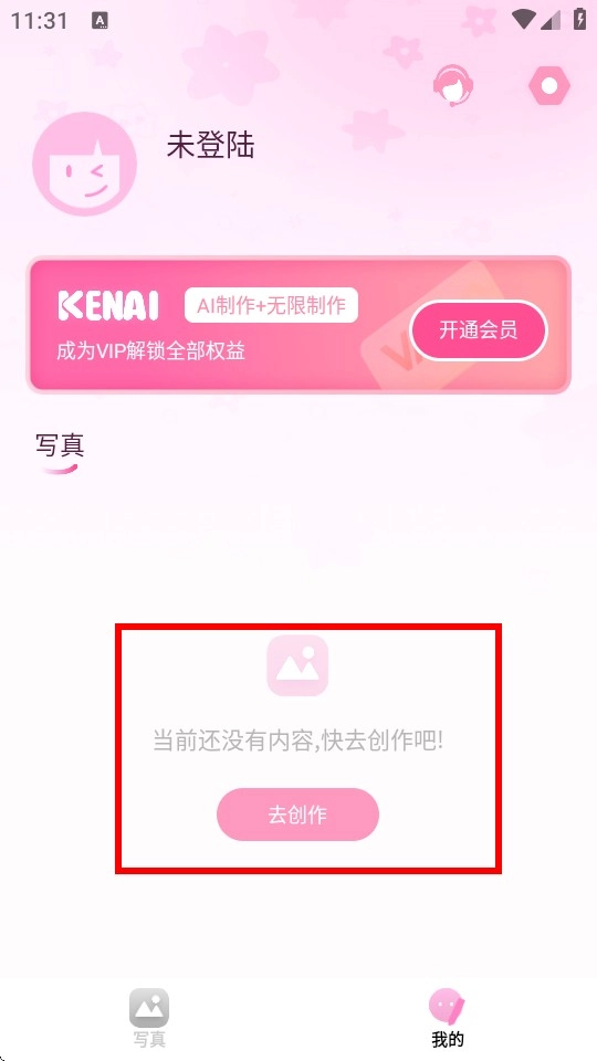 3、进入“我的”页面,点击“去创作”,即可自行制作头像、进行修图、试用滤镜,打造独特专属风格!