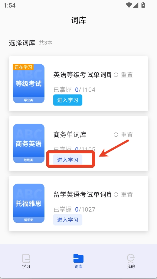 3、完成选择后,返回至【学习】界面,此时词库即切换成功。