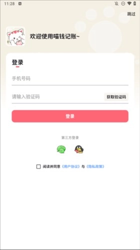 1、第一步,打开已安装好的喵钱记账安卓版。它的登录方式十分灵活,支持手机号登录,也能通过QQ或微信一键进入,操作便捷无比。