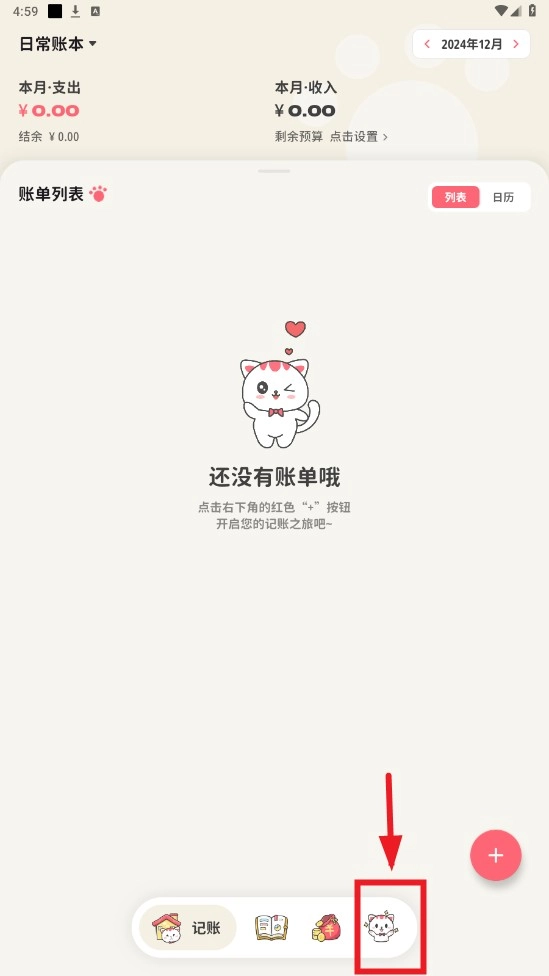 1. 打开喵钱记账安卓版并进入,点击屏幕下方的猫咪图标,即可开启个人中心。