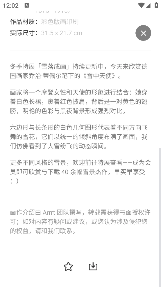 2、当您进入名画介绍详情页面时,便能获取详尽的画作解说内容,同时该页面还支持用户进行收藏操作。