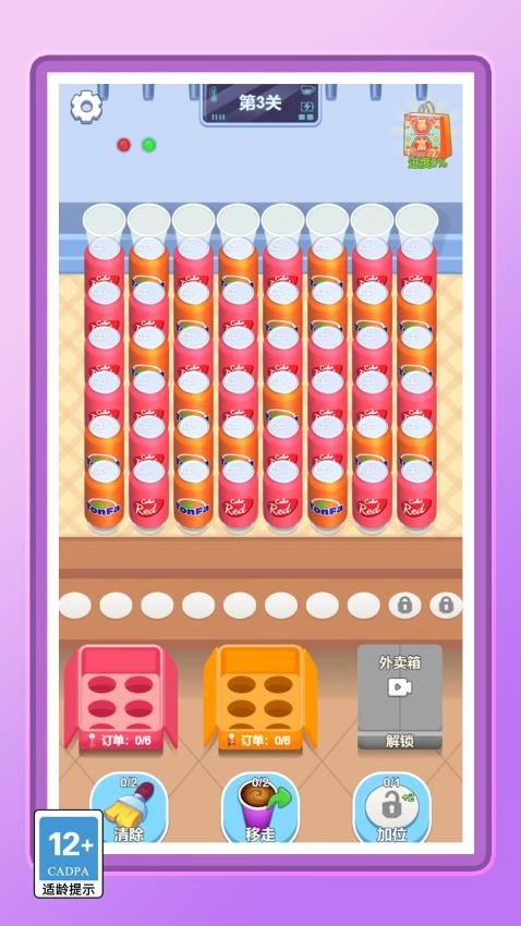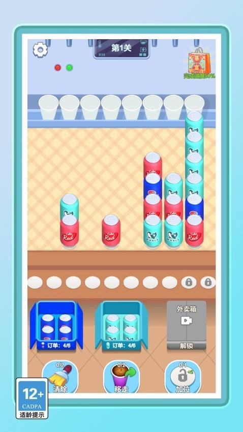 2、移走多余的饮料,就能获得更多空位,把顾客所需的饮料瓶放入这些空位,便可完成订单。
