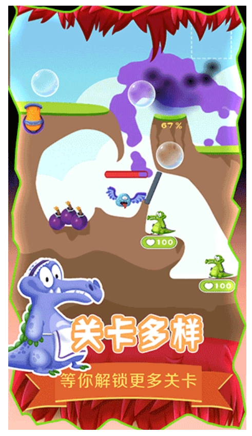 3、玩家凭借合理的思索与操作,解救被困于各类陷阱中的可爱小鳄鱼。玩法轻松有趣,上手难度较低,每位玩家都能收获别样乐趣,开动脑筋去解开一道道谜题。