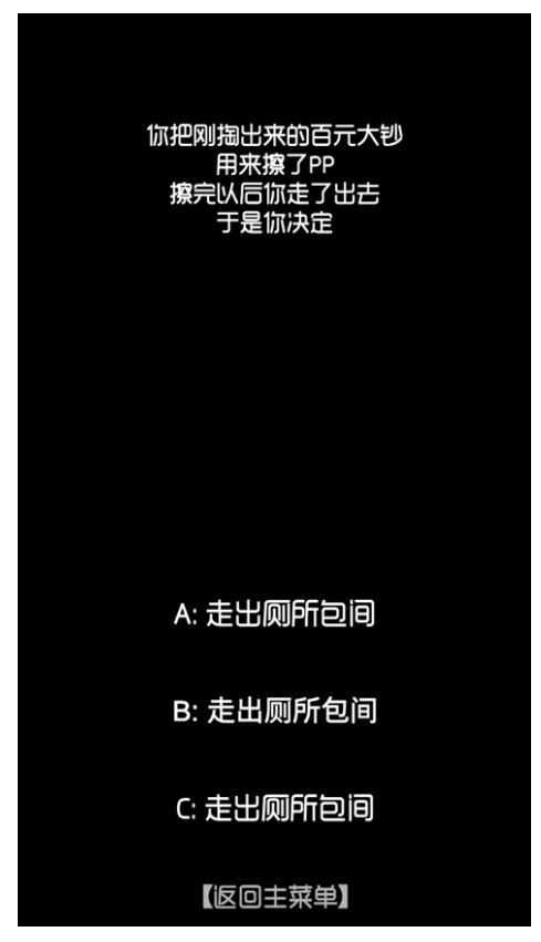 2、文字剧情类游戏设有充满趣味性的剧情关卡。在游戏里,玩家会被困于厕所之中,需寻觅合适时机逃脱。此外,游戏增添了诸多挑战玩法,玩家得绞尽脑汁,尽快逃离,以完成这些挑战。