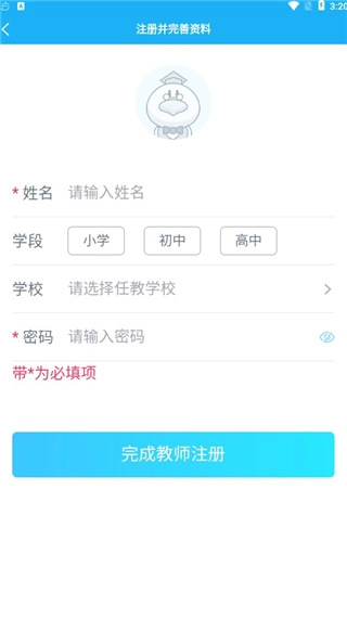 2、接下来点击注册按钮,依次填写姓名、学段、学校等各类基本资料,填写完毕后,点击完成教师注册。