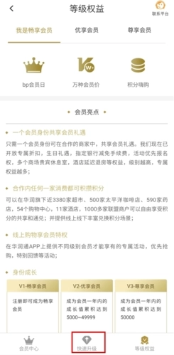 2、于等级权益页面,需达成一定积分方可升级,点击下方的快速升级按钮。