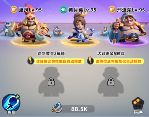 阵容中最多可上阵5个武将,前三个武将的技能释放由玩家操控,后两个位置的武将技能则自动释放。