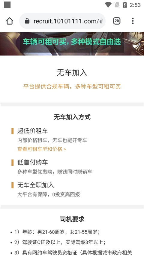 3、如我们选择无车加入,里面为用户提供了三种模式,低价租车、低首付购车以及无车全职加入;