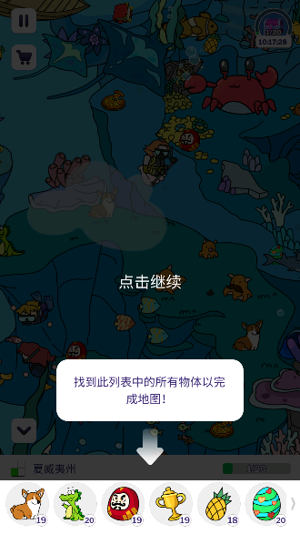 2、进入游戏按照指引点击物体收集寻宝物品。