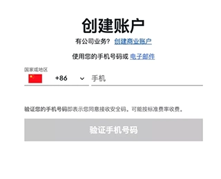 第二步:于“创建帐户”页面,选择通过手机号码或者电子邮件进行注册,并输入相关信息。