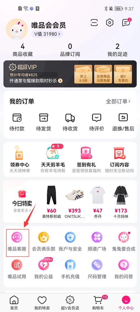 在个人中心页面,点击【唯品客服】图标。