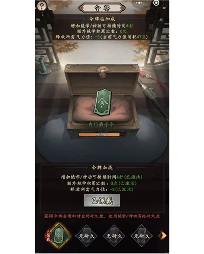 (2)其次,细心的少侠想必已经注意到,在上述截图里提到了(令牌 - 3),这里实际上指的就是门派令牌,发动门派绝学需要消耗令牌的耐久。